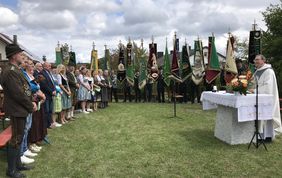 Am Süßer Kirchlein wurden sie von der Organistin Renate Werner und den acht Hahnbacher Sängern unter Andreas Hubmann erwartet. „Wer glaubt, ist nie allein“ eröffnete die Eucharistiefeier im Freien mit Pfarrvikar Christian Preitschaft. In seiner Predigt lobte dieser die bleibenden Aufgaben der Vereine, die mit Pflege des Brauchtums und Geselligkeit gegen Vereinsamung und für Solidarität stünden. Er riet stets die Ziele im Auge zu behalten sowie auf Behutsamkeit, Konzentration, einen festen Stand und ein klares Reglement zu achten. Dann entstehe aus Zusammenhalt, Energie und Ausdauer schließlich große Freude und Dankbarkeit wie bei diesem Jubiläum. Nach dem Vereinslied der Süßer Edelweißschützen ging es zurück zur großen Gemeindehalle, wo nach Spalier und Fahnen schwingendem Einzug die Hahnbacher Marktbläser fleißig aufspielten.