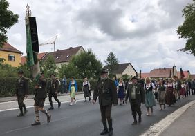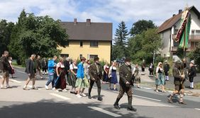 Lautstark ließen es acht Böllerschützen aus Vilseck und Sulzbach-Rosenberg dreimal krachen, bevor die Hahnbacher Marktbläser in Vollbesetzung unter Matthias Fenk den langen beeindruckenden Zug in der Dorfstraße anführten. Ihnen folgten der Jubelverein, die Ehrengäste, die Gaukönige und weitere Hunderte an Vereinsmitgliedern aus Nah und Fern mit ihren Fahnen.